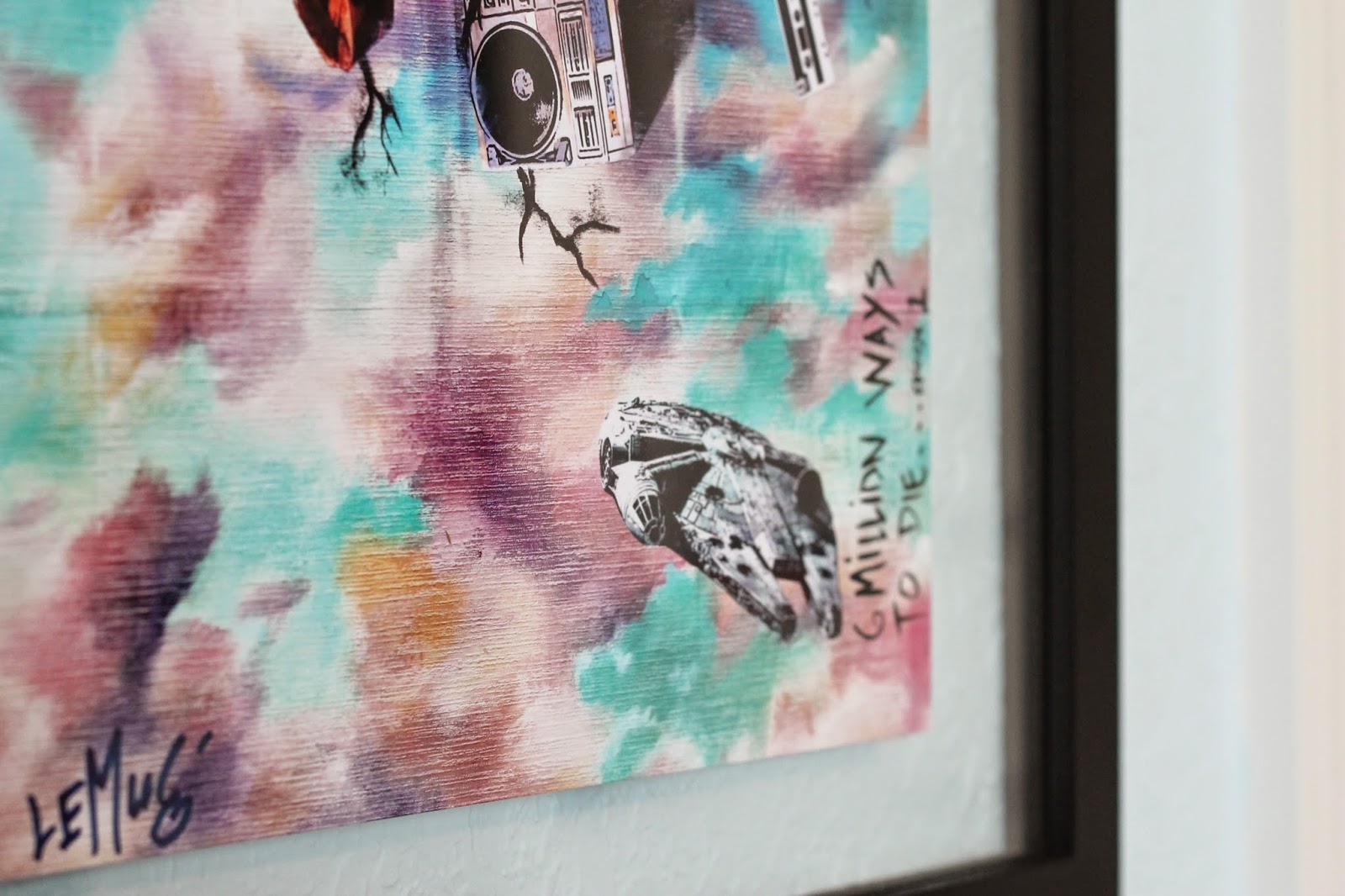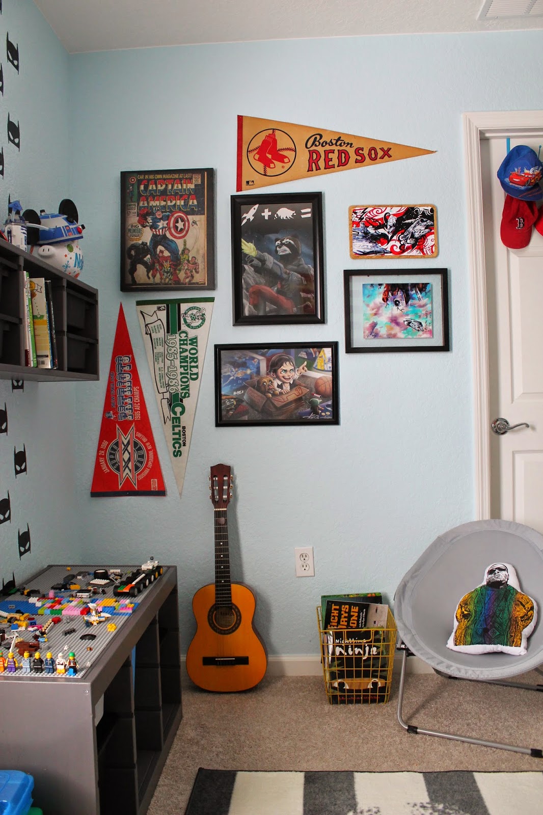 We wanted to bring in original artwork that shows Nolan's most favorite things. This wall is a work in progress but I love it. And the pennants from my husbands childhood adds just the right amount of vintage charm to this wall.