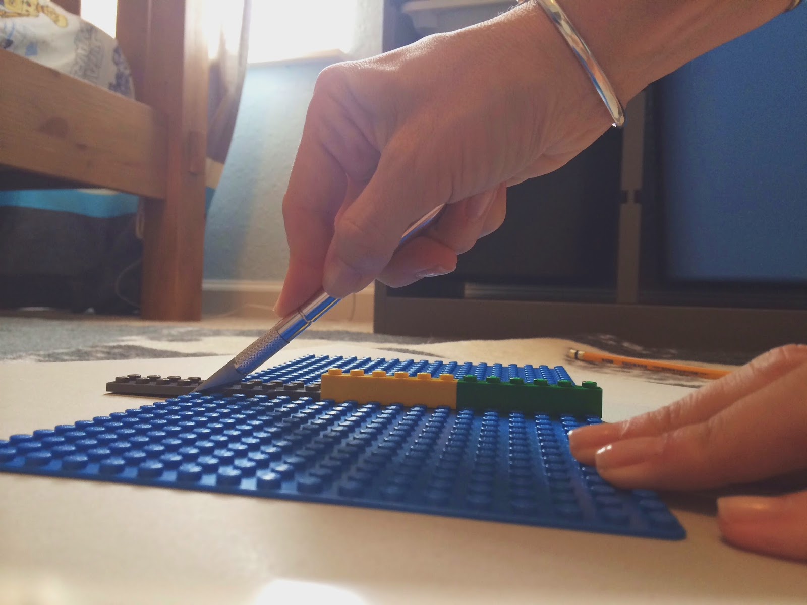 For the lego top, I used two large gray lego mats for each side and cut down one blue mat to create the center strip. Cutting lego mats is easy peasy, create a line with some brick legos take an exacto knife and cut along edge. Then snap off.