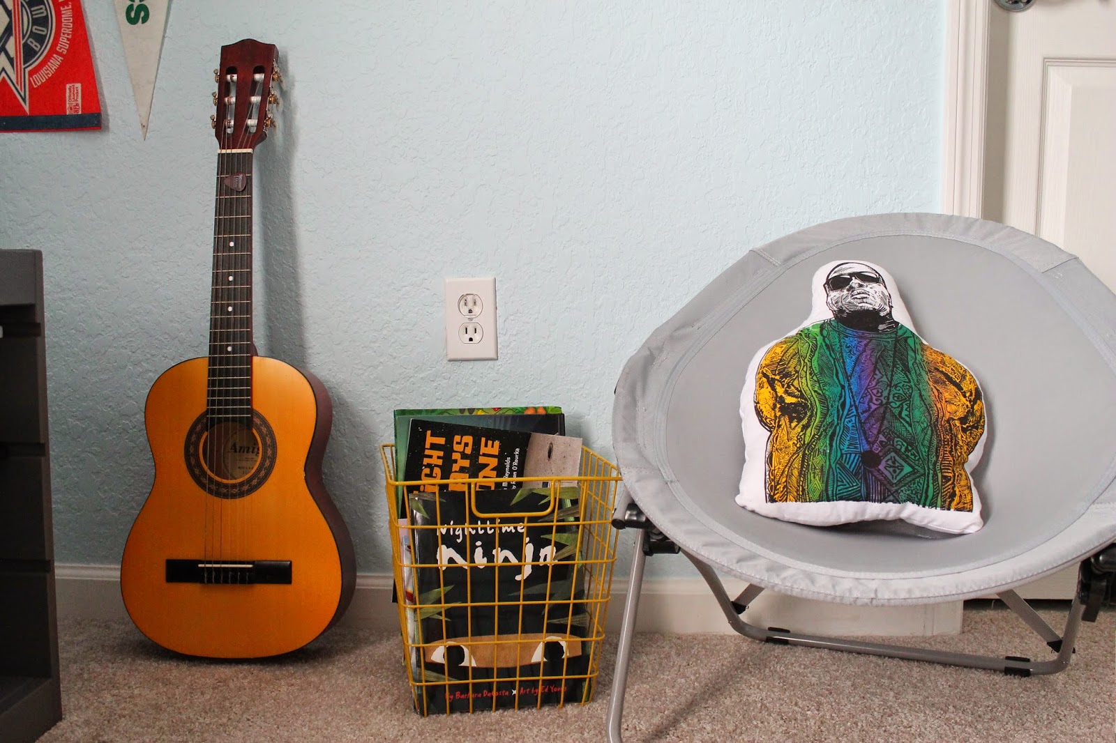 Yellow bin also from Target and the AMAZING Biggie pillow from Passive Juice Motel.